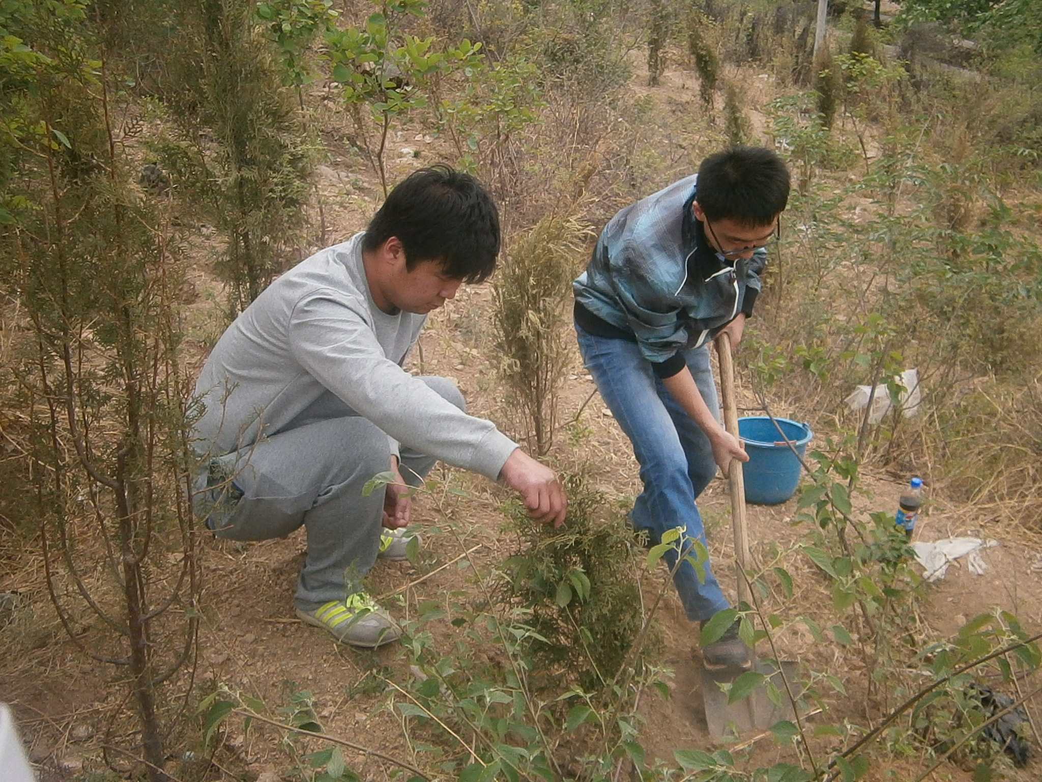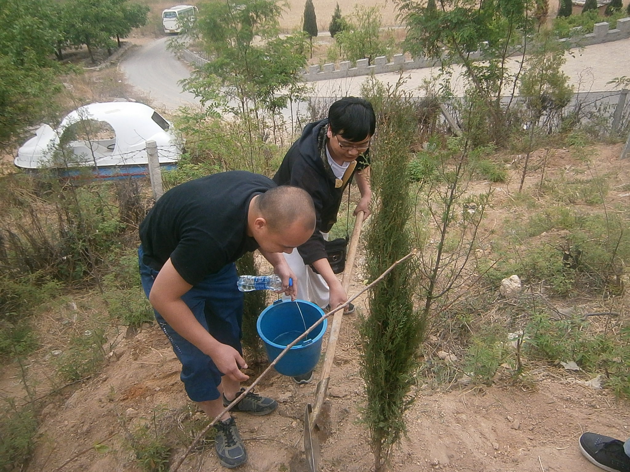 活動(dòng)請(qǐng)植樹基地的安師傅為我們講解了植樹流程以及注意事項(xiàng),并給每人發(fā)放了水桶、鐵鍬等工具,之后便3人一組的開始了。過程雖然有些累,但是大家積極踴躍,充滿了熱情。你扶樹苗,我鏟土,很快一棵棵樹苗站立了起來。當(dāng)時(shí)大家都非常的興奮,對(duì)于部分青年這是人生中的第一次植樹。